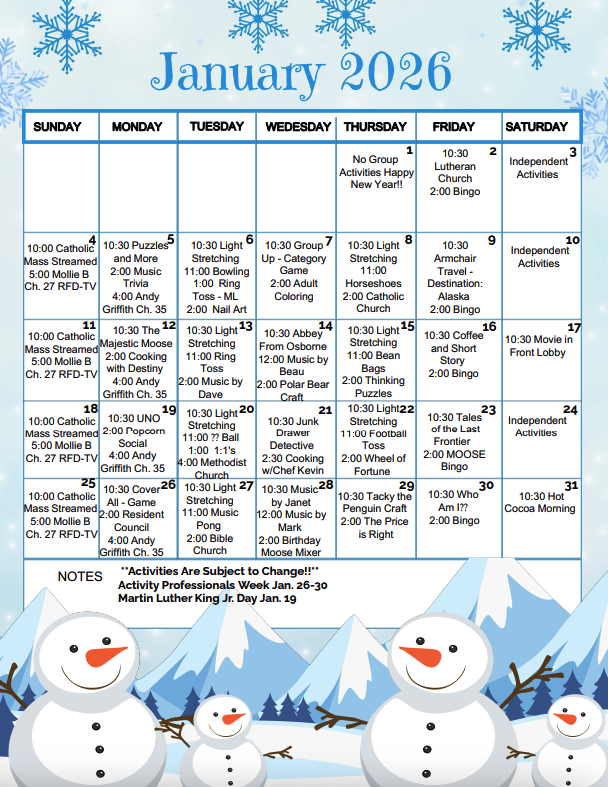 Edgewood Convalescent Home Activity Calendar- January 2026